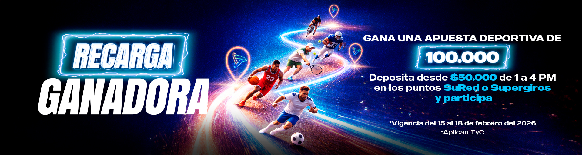 R1129 “Recarga Ganadora” Participa en la actividad “R1129 Recarga Ganadora”, desde el Domingo 15 de febrero de 2026 hasta el miércoles 18 de febrer R1129 “Recarga Ganadora” Más información APUESTA MAESTRA Acumula la mayor cantidad de créditos para la participación apostados en el riel de casino en vivo “APUESTA MAESTRA” y participa po APUESTA MAESTRA Más información R1124 “Gira y Gana con BetPlay” Participa en la actividad “R1124 Gira y Gana con BetPlay”, desde el Domingo 18 de enero de 2026 hasta el miércoles R1124 “Gira y Gana con BetPlay” Más información CAMPAÑA CLIENTES Nombre de la campaña: CONÉCTATE CON SUPERGIROS Inicio de la campaña: 1 de enero de 2026 Cierre de la campaña: 28 de febrero CAMPAÑA CLIENTES Más información RED DE SERVICIOS DE LA ORINOQUIA Y EL CARIBE S.A. organiza y desarrolla la presente dinámica comercial bajo los siguientes lineamientos, que cumplan c ESTRENANDO APP Más información {{content:chars:150}} {{title}} Más información ➢ Entre más transacciones deposite en los buzones, más oportunidades tiene de ganar. ➢ Cada cliente podrá ganar máximo 1 premio. ➢ Para reclamar el REGALOS POR MONTONES Más información Acumula la mayor cantidad de valor apostado en el riel de casino en vivo “Ruletas del Terror” y participa por una bolsa de $50 MILLONES. Vigencia d RULETAS DEL TERROR Más información EL REY DEL BASQUET Participa en “EL REY DEL BÁSQUET” desde el 15 al 31 de octubre de 2025. Apuesta en la sección NBA y podrás ganar una apuesta dep EL REY DEL BASQUET Más información Acumula la mayor cantidad de rondas en el riel de casino “Ruby Embrujado” y participa por $100 MILLONES, serán 2000 ganadores. Vigencia del 06 al 1 RUBY EMBRUJADO Más información